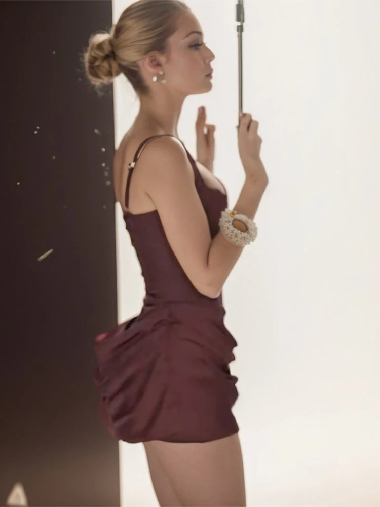 Chic Brown Pleated Hem Mini Dress Women's Elegant U-neck Sleeveless Back Bandage Slim Vestidos 2025 New Summer Lady Party Gown