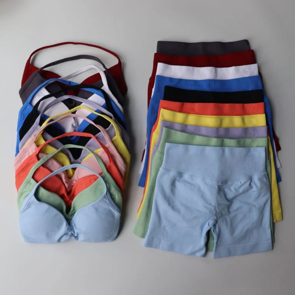 Impact Gym Set Women Two Piece Strappy Yoga Bra Top Workout Scrunch Shorts Suit Fitness Clothes Seamless Sportswear Workout Set