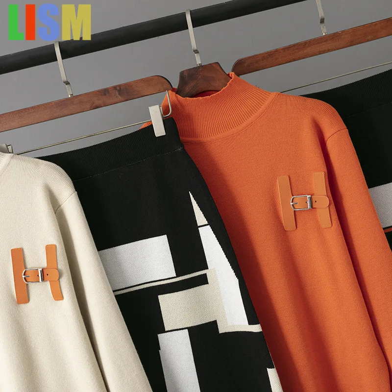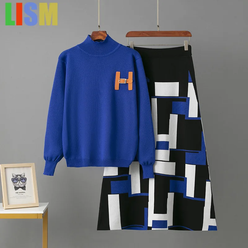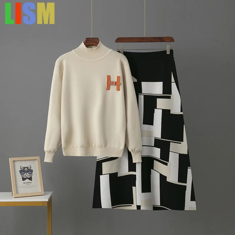 LISM winter two piece set for womam suit elegant sweater new in matching sets letter half body mid length skirt set New dress