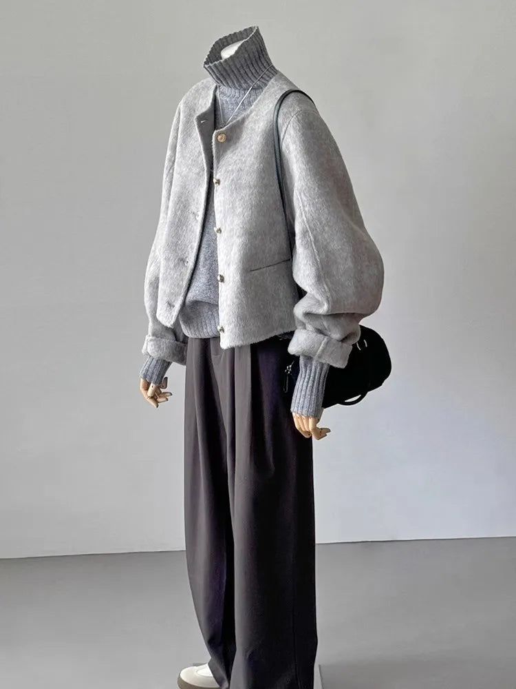 Single Breasted Woolen Jacket Women's Autumn Winter New Korean O-neck Short Solid Outwear Fashion Long Sleeved Warm Top