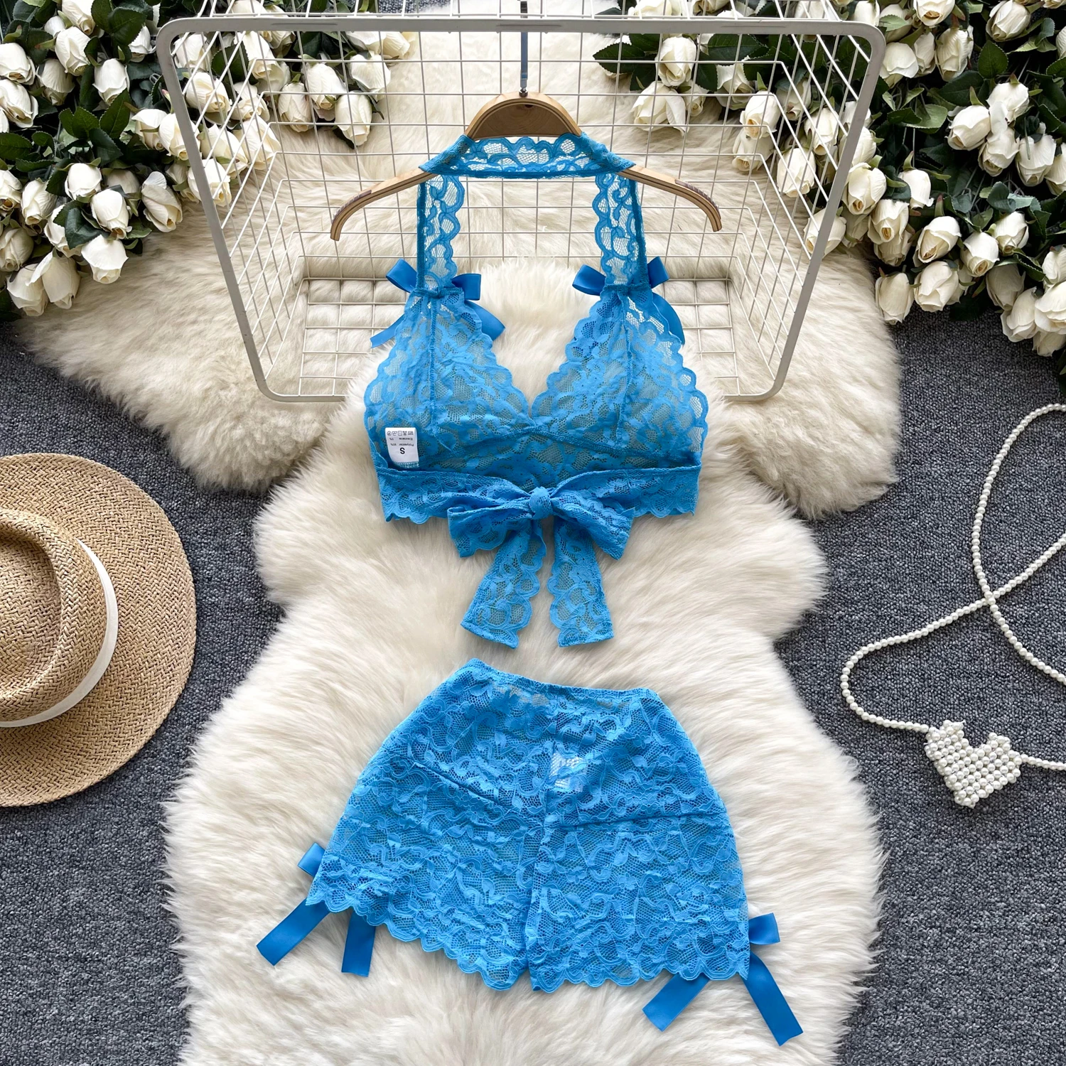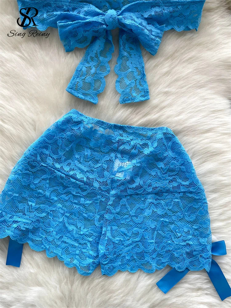 SINGREINY Lace Sheer Sexy Suits Halter V-Neck Bandage Short Tops+Mini Shorts 2024 Women Backless Bow Hotsweet Two Pieces Sets