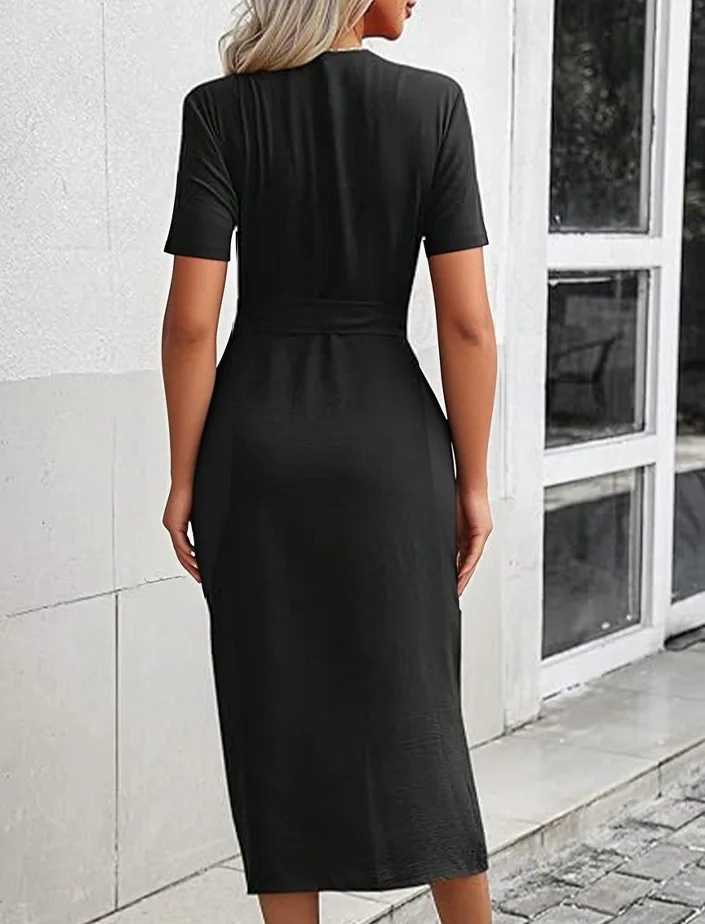 Solid Color Lapel Sexy V-neck Waist Tie Summer New Short Sleeved Long Sleeved Hem Slit Slim Fit Single Breasted Dress For Women
