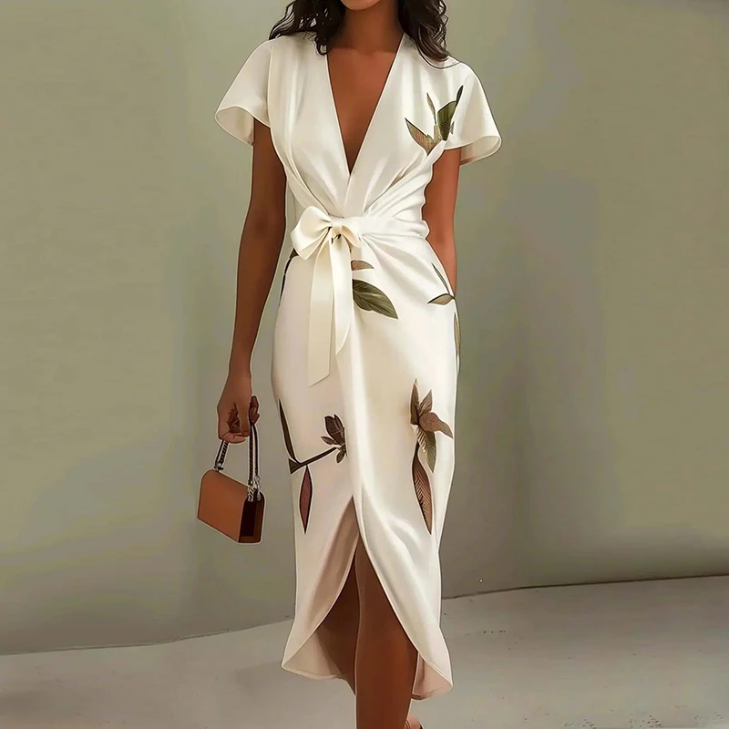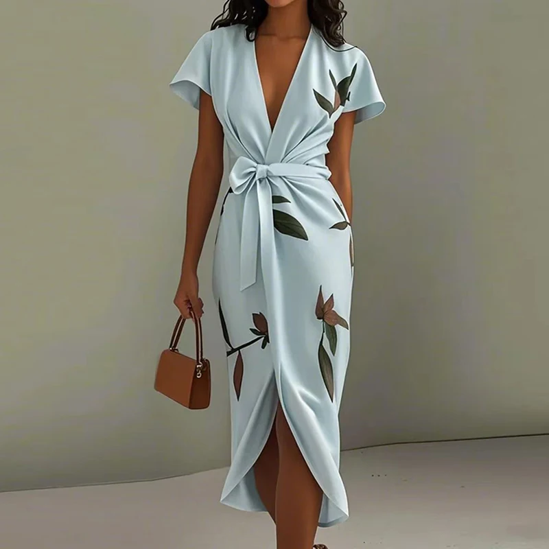 Spring Summer Tie-up Bow Long Dresses Elegant Floral Print Irregular Slim Boho Dress Woman Sexy V-Neck Knot Hollow Party Dresses
