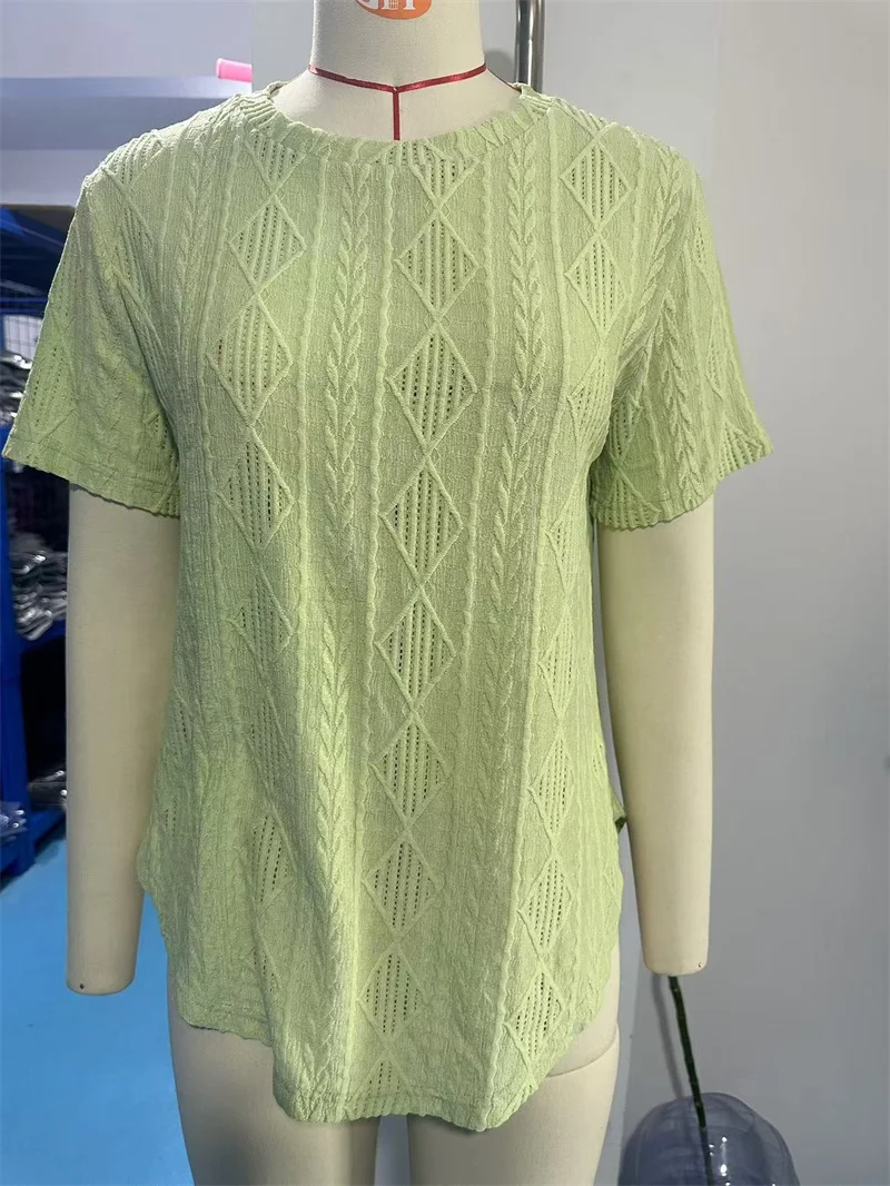Summer 2025 New Women Shirt Round Neck Back Button Jacquard Hollow Out Short Sleeve Shirt Tops Fashion Casual Solid Loose Blouse