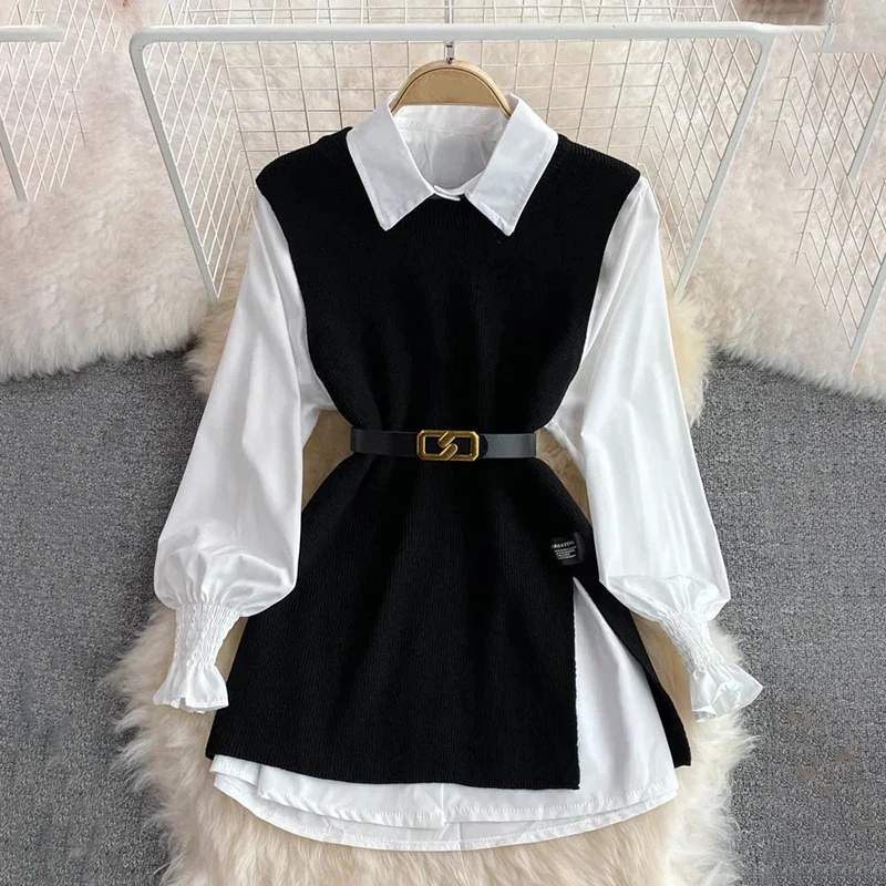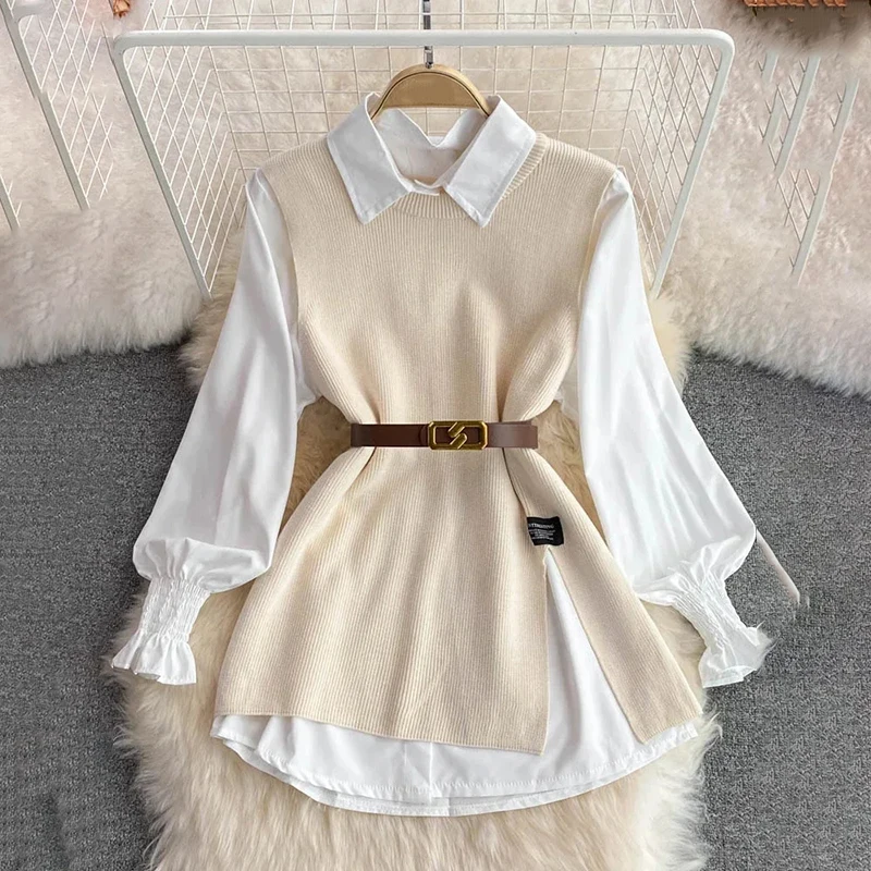 Syiwidii Blouses Sets Women Knitted Sweater Vests Autumn 2024 Fashion Turn-down Collar Single Breasted Female Blouses Two-piece