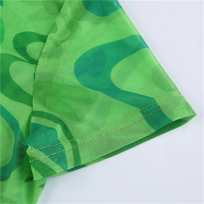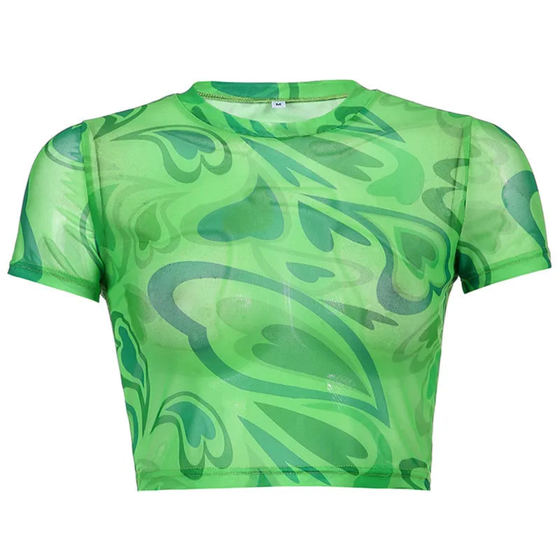 T-shirt Vrouwen Zomer Roze Hart Gedrukt Esthetiek See Through Mesh Koreaanse Korte Mouw Voor Zoete Kawaii Meisjes 2022 Crop top