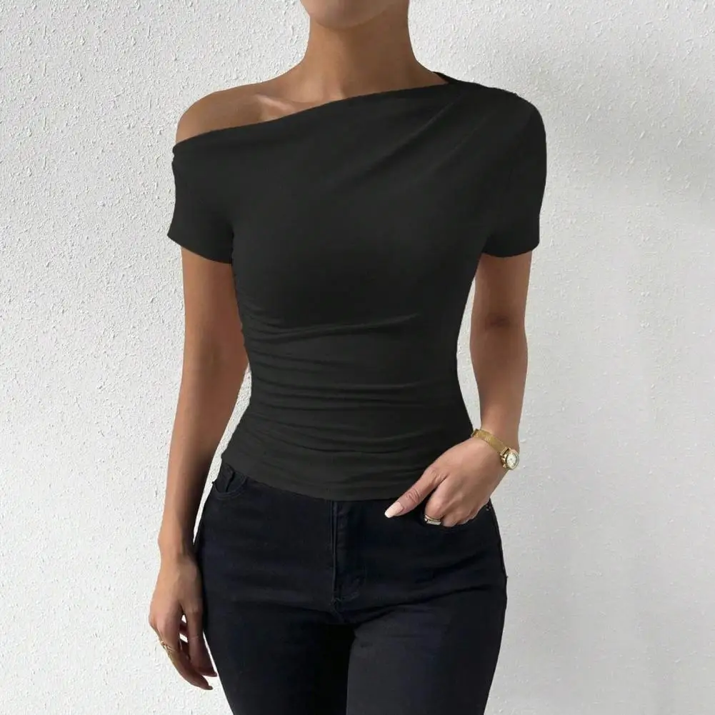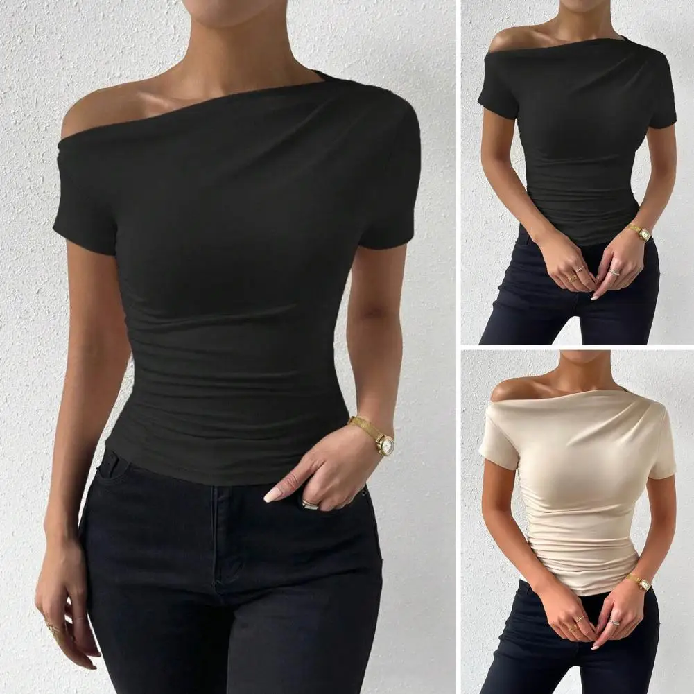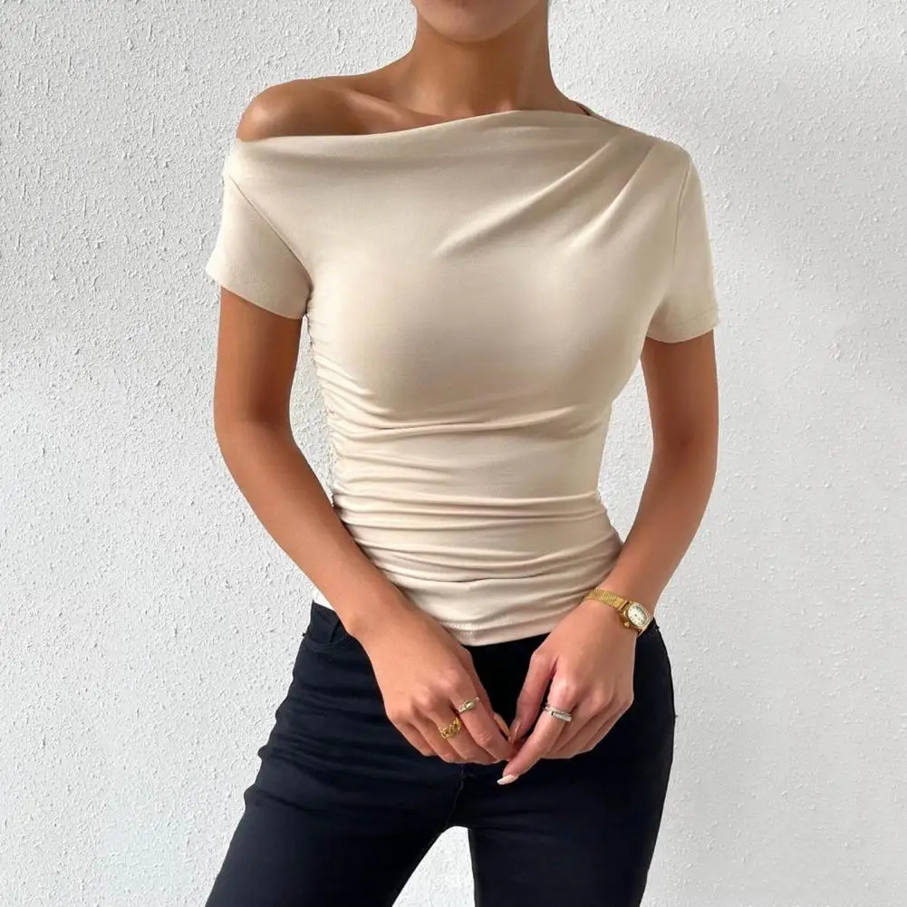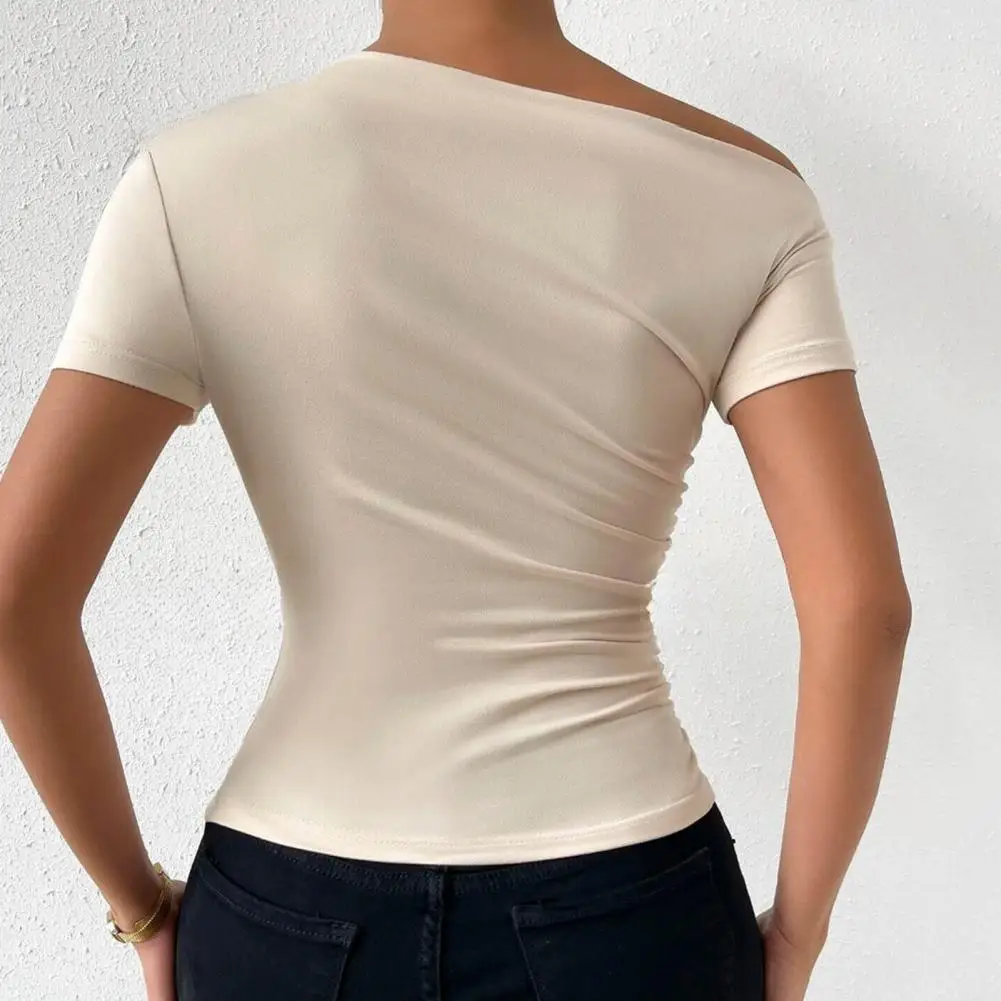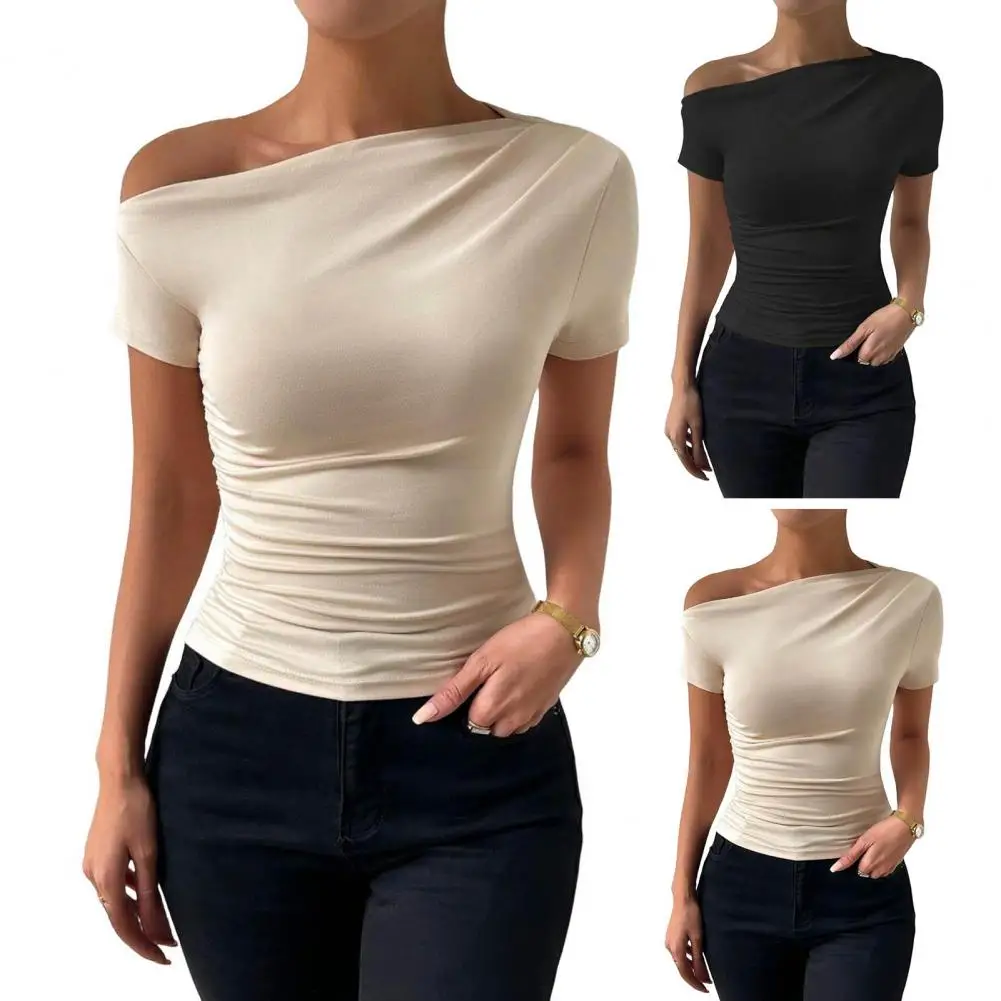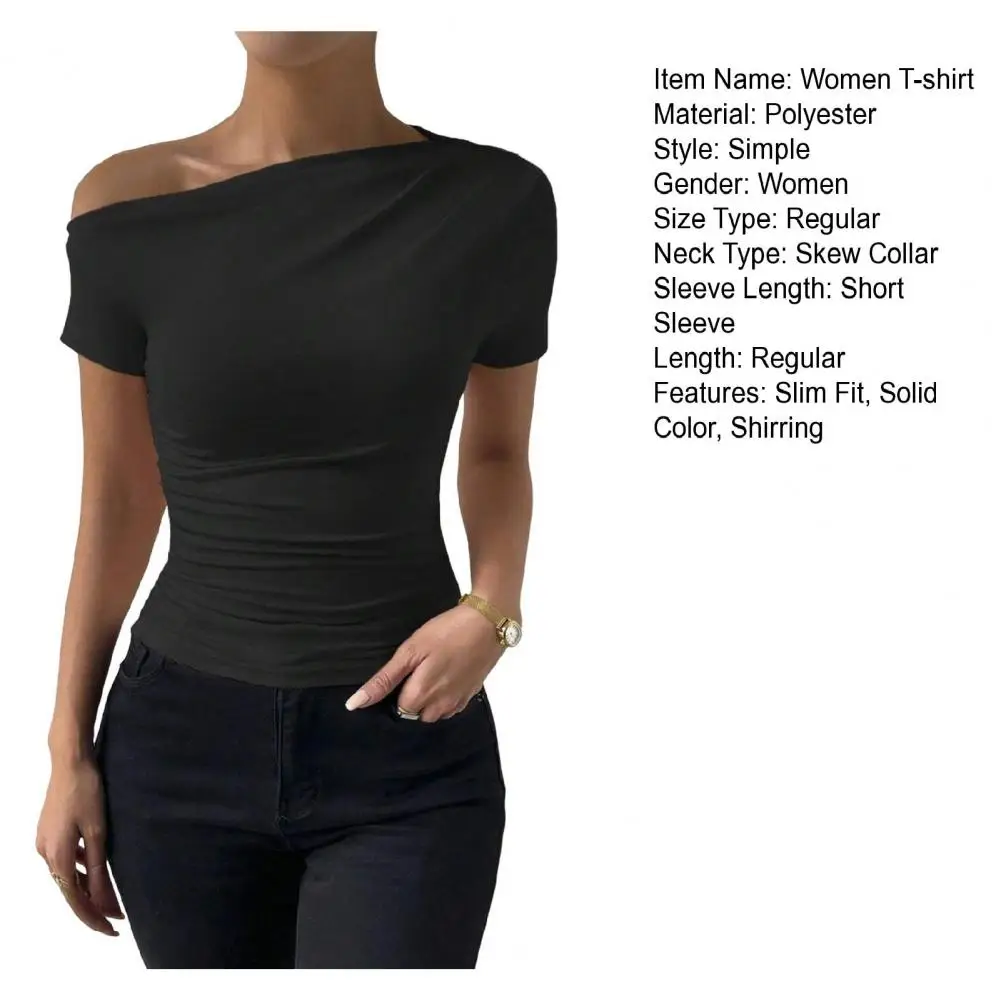 Women Summer T-shirt Skew Collar Short Sleeve Slim Fit Tee Shirt Solid Color Side Shirring Pullover Tops